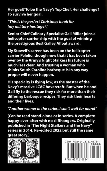 Her goal? To be the Navy's Top Chef. Her challenge? To survive her goal. "This is the perfect Christmas book for (my military heritage)." Senior Chief Culinary Specialist Gail Miller joins a helicopter carrier ship with the goal of winning the prestigious Best Galley Afloat award. Sly Stowell's career has been on the helicopter carrier Peleliu, though now that it has been taken over by the Army's Night Stalkers his future is much less clear. And trusting a woman who thinks South Carolina barbeque is in any way proper will never happen. His specialty is flying low, as the master of the Navy's massive LCAC hovercraft. But when he and Gail fly to the rescue they risk far more than their differing barbeque recipes. They risk their hearts and their lives. "Another winner in the series. I can't wait for more!" [Can be read stand-alone or in series. A complete happy-ever-after with no cliffhangers. Originally published in "The Night Stalkers and the Navy" series in 2014. Re-edited 2022 but still the same great story.] Buy now and celebrate the Christmas holidays.
