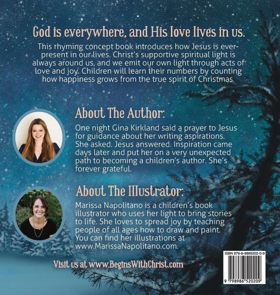 God is everywhere, and His love lives in us. This rhyming concept book introduces how Jesus is always in our lives. Beautiful illustrations show Christ's supportive spiritual light around us. When we share God's light through acts of love and joy, it creates a ripple effect. Children will learn their numbers by counting how happiness grows from the true spirit of Christmas. Both children and adults are reminded through lyrical prose to pause and connect with Jesus. Christmas Begins With Christ is the perfect gift for the holiday season that's sure to inspire families for years to come.
