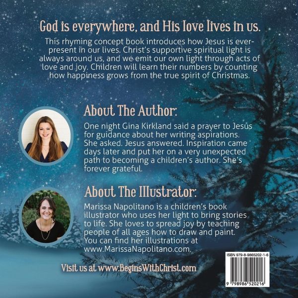 God is everywhere, and His love lives in us. This rhyming concept book introduces how Jesus is always in our lives. Beautiful illustrations show Christ's supportive spiritual light around us. When we share God's light through acts of love and joy, it creates a ripple effect. Children will learn their numbers by counting how happiness grows from the true spirit of Christmas. Both children and adults are reminded through lyrical prose to pause and connect with Jesus. Christmas Begins With Christ is the perfect gift for the holiday season that's sure to inspire families for years to come.