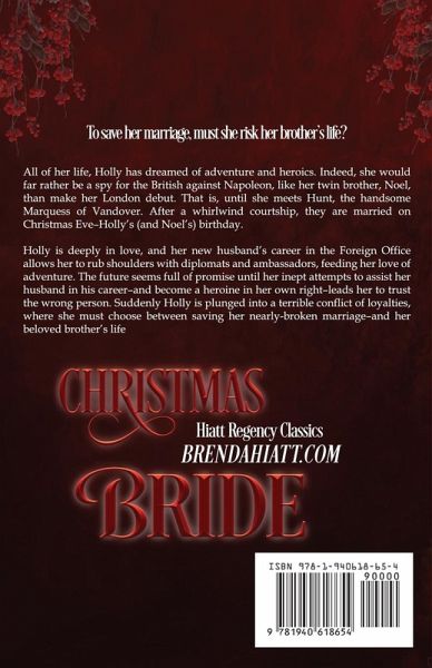 To save her marriage, must she risk her brother's life? All of her life, Holly has dreamed of adventure and heroics. Indeed, she would far rather be a spy for the British against Napoleon, like her twin brother, Noel, than make her London debut. That is, until she meets Hunt, the handsome Marquess of Vandover. After a whirlwind courtship, they are married on Christmas Eve-Holly's (and Noel's) birthday. Holly is deeply in love, and her new husband's career in the Foreign Office allows her to rub shoulders with diplomats and ambassadors, feeding her love of adventure. The future seems full of promise until her inept attempts to assist her husband in his career-and become a heroine in her own right-leads her to trust the wrong person. Suddenly Holly is plunged into a terrible conflict of loyalties, where she must choose between saving her nearly-broken marriage-and her beloved brother's life! Book 5 of Brenda Hiatt's bestselling Hiatt Regency Classics collection.