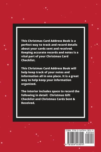 This Christmas Card Address Book is a perfect way to keep track of your Christmas card list and cards that you send and receive. Also includes a bonus Christmas gift checklist. The interior contains sections and a place to record the following: Christmas Gift Checklist - Checklist for Name, Gift, Sent, Budget, Cost, Total Christmas Cards - Checklist for Name, Relation, Address, Bought Card, Sent Card, Received Card This beautiful Christmas Card Address Book is a great way to keep you organized through the busy holiday season. Also makes a great gift for that special person in your life who loves sending Christmas cards. Simple and easy to use. Size is 6x9 inches, 84 pages, soft matte finish cover, white paper, black ink, paperback.