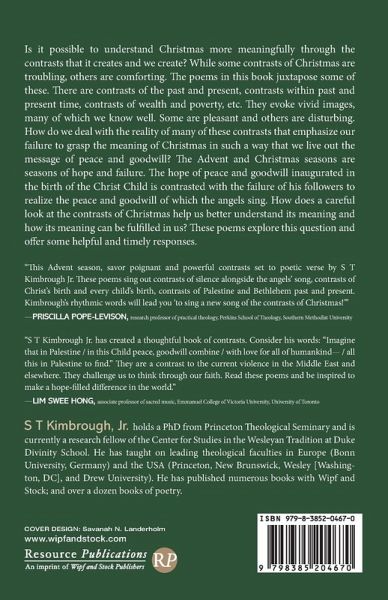 Is it possible to understand Christmas more meaningfully through the contrasts that it creates and we create? While some contrasts of Christmas are troubling, others are comforting. The poems in this book juxtapose some of these. There are contrasts of the past and present, contrasts within past and present time, contrasts of wealth and poverty, etc. They evoke vivid images, many of which we know well. Some are pleasant and others are disturbing. How do we deal with the reality of many of these contrasts that emphasize our failure to grasp the meaning of Christmas in such a way that we live out the message of peace and goodwill? The Advent and Christmas seasons are seasons of hope and failure. The hope of peace and goodwill inaugurated in the birth of the Christ Child is contrasted with the failure of his followers to realize the peace and goodwill of which the angels sing. How does a careful look at the contrasts of Christmas help us better understand its meaning and how its meaning can be fulfilled in us? These poems explore this question and offer some helpful and timely responses.