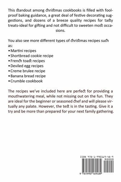 This standout among christmas cookbooks is filled with foolproof baking guidance, a great deal of festive decorating suggestions, and dozens of a breeze quality recipes for tasty treats-ideal for gifting and not difficult to sweeten most occasions. You also see more different types of christmas recipes such as: ¿ Martini recipes ¿ Shortbread cookie recipe ¿ French toast recipes ¿ Deviled egg recipes ¿ Creme brulee recipe ¿ Banana bread recipe ¿ Crumble cookbook The recipes we've included here are perfect for providing a mouthwatering meal, while not missing out on the fun. They are ideal for the beginner or seasoned chef and will please virtually any palate. However, the test is in the tasting. Give it a try and be more than prepared for your next family gathering.