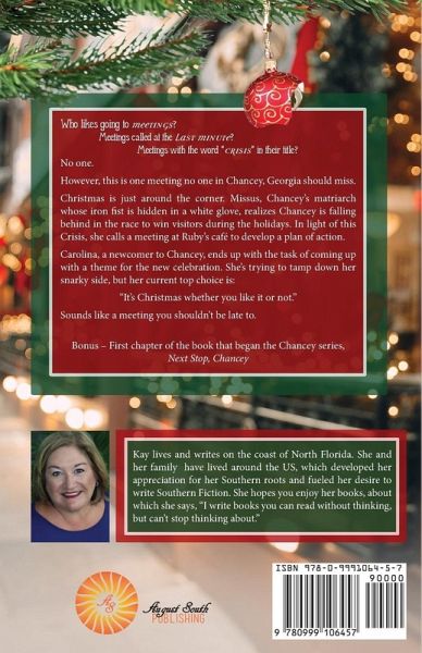Christmas Novella set in the popular fictional town of Chancey, Georgia. Whether this is your first trip to Chancey, or you're an old friend - Welcome! Missus has called an emergency meeting and this is one meeting you don't want to miss. Christmas is just around the corner and there's a crisis! And you never want to miss a meeting in a small town because you just might end up in charge of the Christmas Parade. Memories surface, tempers flare, and new suggestions get shot down because it's never been done that way before. This novella is a perfect way to sip a cup of hot cocoa and take a quick trip to a small Southern town for the holidays.