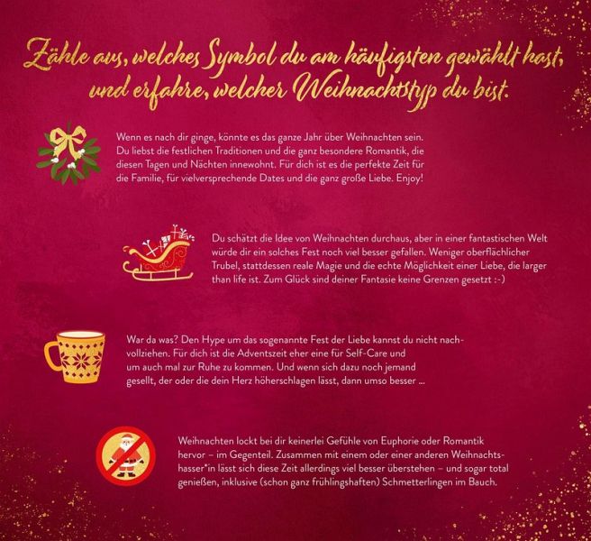 Die weihnachtliche Kurzgeschichten-Sammlung enthält herzerwärmende, knisternde und einfach traumhaft schöne Liebesgeschichten von Ada Bailey, Andreas Dutter, Antonia Wesseling, Basma Hallak, Beril Kehribar, Christian Handel, Inka Lindberg, Janine Ukena, Jennifer Wiley, Julia Hausburg, Julia Niederstraßer, Justine Pust, Kristin MacIver, Laura Labas, Lea Kaib, Lin Rina, Maike Voß, Malou Bichon, Nica Stevens, Nina Bilinszki, Noah Stoffers, Regina Meissner, Sarah Saxx und Valentina Fast.