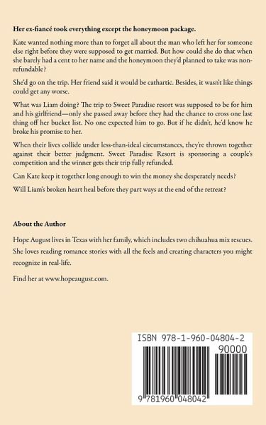Her ex-fiancé took everything except the honeymoon package. Kate wanted nothing more than to forget all about the man who left her for someone else right before they were supposed to get married. But how could she do that when she barely had a cent to her name and the honeymoon they'd planned to take was non-refundable? She'd go on the trip. Her friend said it would be cathartic. Besides, it wasn't like things could get any worse. What was Liam doing? The trip to Sweet Paradise resort was supposed to be for him and his girlfriend-only she passed away before they had the chance to cross one last thing off her bucket list. No one expected him to go. But if he didn't, he'd know he broke his promise to her. When their lives collide under less-than-ideal circumstances, they're thrown together against their better judgment. Sweet Paradise Resort is sponsoring a couple's competition and the winner gets their trip fully refunded. Can Kate keep it together long enough to win the money she desperately needs? Will Liam's broken heart heal before they part ways at the end of the retreat? If you like Christmas music, freshly fallen snow, and crackling fireplaces, then you'll love this sweet holiday romance from Hope August.