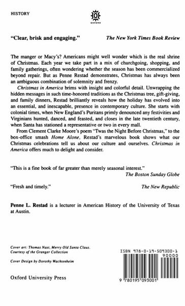 Twentieth-century America often seems obsessed with the idea of Christmas. It is a time of public displays, illuminated department stores, and the showing of popular films such as Miracle on 34th Street, and It's a Wonderful Life. This book describes the evolution of Christmas celebration in America since the early 17th century. It looks how there came about such holiday traditions as Santa Claus, Christmas trees and trimmings, gift-giving and charity-giving, Christmas cards and wrappings. The book brilliantly puts this description into the broader context of social and economic change, the influence of women, and the impact of popular entertainment and culture. Did you know...? * The effects of the Civil War helped establish Christmas as a national holiday, as soldiers and their families increasingly saw it as a symbol of `home'. * During the early years of the nation, Puritan New England hardly celebrated Christmas at all, while in the South it was a sumptuous and rowdy occasion. * The tradition of the Christmas tree was introduced to America by German immigrants. * A little known clergyman, Clement Moore, largely created the image of Santa Claus with his `An Account of the Visit from St. Nicholas'.