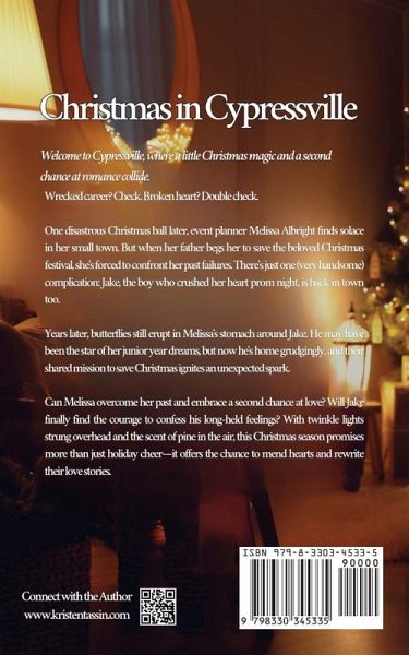 Welcome to Cypressville, where a little Christmas magic and a second chance at romance collide. Wrecked career? Check. Broken heart? Double check. One disastrous Christmas ball later, event planner Melissa Albright finds solace in her small town. But when her father begs her to save the beloved Christmas festival, she's forced to confront her past failures. There's just one (very handsome) complication: Jake, the boy who crushed her heart prom night, is back in town too. Years later, butterflies still erupt in Melissa's stomach around Jake. He may have been the star of her junior year dreams, but now he's home grudgingly, and their shared mission to save Christmas ignites an unexpected spark. Can Melissa overcome her past and embrace a second chance at love? Will Jake finally find the courage to confess his long-held feelings? With twinkle lights strung overhead and the scent of pine in the air, this Christmas season promises more than just holiday cheer-it offers the chance to mend hearts and rewrite their love stories. Christmas in Cypressville is book one in A Cypressville Novel series. This second-chance romance is steeped in holiday cheer and will enchant sweet romance readers everywhere. Start the series now!
