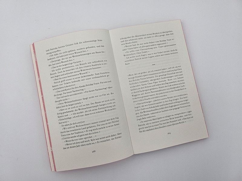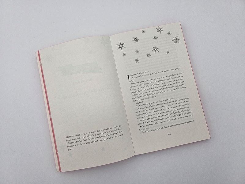 Das Cover des Buches ist ein absoluter Traum und konnte mich sehr begeistern, sogar noch mehr als das Cover aus dem letzten Jahr. Ich liebe einfach die Farbkombination und wie schön das Rot auf dem Grün aussieht. Zudem zeigen die kleinen Elemente, wie die Schneeflocken, Zweige und Tannenzapfen auf, wie viel Liebe in die Gestaltung des Buches gesteckt wurde. Außerdem hat das Buch noch einen unglaublich schönen Farbschnitt, der noch seinen Teil dazu beiträgt, dass dieses Buch ein absoluter Hingucker ist.