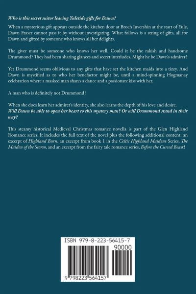 Who is this secret suitor leaving Yuletide gifts for Dawn? When a mysterious gift appears outside the kitchen door at Broch Invershin at the start of Yule, Dawn Fraser cannot pass it by without investigating. What follows is a string of gifts, all for Dawn and gifted by someone who knows all her delights. The giver must be someone who knows her well. Could it be the rakish and handsome Drummond? They had been sharing glances and secret interludes. Might he be Dawn's admirer? Yet Drummond seems oblivious to any gifts that have set the kitchen maids into a tizzy. And Dawn is mystified as to who her benefactor might be, until a mind-spinning Hogmanay celebration where a masked man shares a dance and a passionate kiss with her. A man who is definitely not Drummond! When she does learn her admirer's identity, she also learns the depth of his love and desire. Will Dawn be able to open her heart to this mystery man? Or will Drummond stand in their way? This steamy historical Medieval Christmas romance novella is part of the Glen Highland Romance series. It includes the full text of the novel plus the following additional content: an excerpt of Highland Burn, an excerpt from book 1 in the Celtic Highland Maidens Series, The Maiden of the Storm, and an excerpt from the fairy tale romance series, Before the Cursed Beast! The novels in this series are each stand-alone stories and can be read individually in any order, if desired. These historical romances are set in Medieval Highlands and do not shy away from steamy scenes, occasional archaic curses, and accurate scenes of Medieval life!