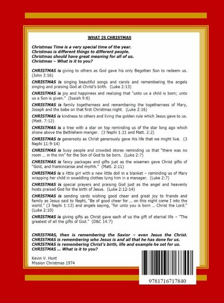 This book is a Christmas musical Cantata for Christmas worship by church congregations, families and other community groups. It contains songs and narration that teach of the divine birth of our Lord Jesus Christ. It teaches of family, Christmas, love of Christ, testimonies of Jesus the Christ, service, and the Joy of Christmas. The book tells of gifts Christ has given us and gifts that we can give to Him at Christmas, The book helps us fell and know of Jesus as our Christmas Light. The book brings us back home for Christmas and helps us remember the true meaning of Christmas and the birth of Jesus Christ, our Savior and Lord.
