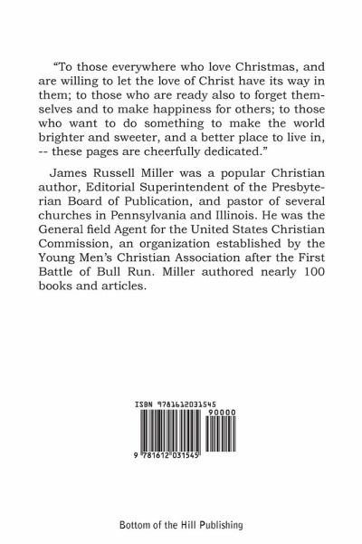 "To those everywhere who love Christmas, and are willing to let the love of Christ have its way in them; to those who are ready also to forget themselves and to make happiness for others; to those who want to do something to make the world brighter and sweeter, and a better place to live in, -- these pages are cheerfully dedicated." James Russell Miller was a popular Christian author, Editorial Superintendent of the Presbyterian Board of Publication, and pastor of several churches in Pennsylvania and Illinois. He was the General field Agent for the United States Christian Commission, an organization established by the Young Men's Christian Association after the First Battle of Bull Run. Miller authored nearly 100 books and articles.
