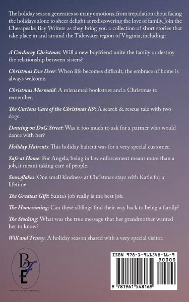 The holiday season generates so many emotions, from trepidation about facing the holidays alone to sheer delight at rediscovering the love of family. Join the Chesapeake Bay Writers as they bring you a collection of short stories that all take place in and around the Tidewater region of Virginia, including: A Corduroy Christmas: Will a new boyfriend unite the family or destroy the relationship between sisters? Christmas Eve Deer: When life becomes difficult, the embrace of home is always welcome. Christmas Mermaid: A misnamed bookstore and a Christmas to remember. The Curious Case of the Christmas K9: A search & rescue tale with two dogs. Dancing on DoG Street: Was it too much to ask for a partner who would dance with her? Holiday Haircuts: This holiday haircut was for a very special customer. Safe at Home: For Angela, being in law enforcement meant more than a job, it meant taking care of people. Snowflakes: One small kindness at Christmas stays with Katie for a lifetime. The Greatest Gift: Santa's job really is the best job. The Homecoming: Can these siblings find their way back to being a family? The Stocking: What was the true message that her grandmother wanted her to know? Will and Trussy: A holiday season shared with a very special visitor.
