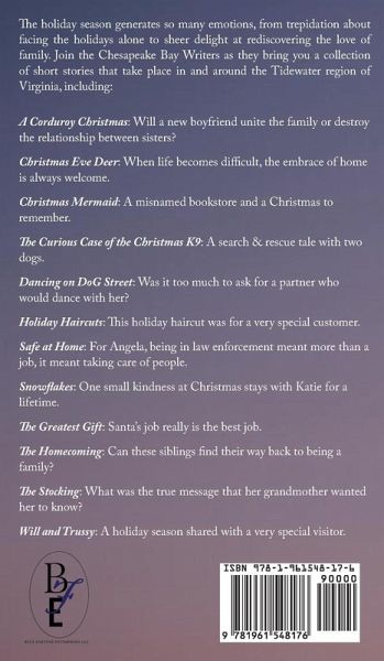 The holiday season generates so many emotions, from trepidation about facing the holidays alone to sheer delight at rediscovering the love of family. Join the Chesapeake Bay Writers as they bring you a collection of short stories that all take place in and around the Tidewater region of Virginia, including: A Corduroy Christmas: Will a new boyfriend unite the family or destroy the relationship between sisters? Christmas Eve Deer: When life becomes difficult, the embrace of home is always welcome. Christmas Mermaid: A misnamed bookstore and a Christmas to remember. The Curious Case of the Christmas K9: A search & rescue tale with two dogs. Dancing on DoG Street: Was it too much to ask for a partner who would dance with her? Holiday Haircuts: This holiday haircut was for a very special customer. Safe at Home: For Angela, being in law enforcement meant more than a job, it meant taking care of people. Snowflakes: One small kindness at Christmas stays with Katie for a lifetime. The Greatest Gift: Santa's job really is the best job. The Homecoming: Can these siblings find their way back to being a family? The Stocking: What was the true message that her grandmother wanted her to know? Will and Trussy: A holiday season shared with a very special visitor.