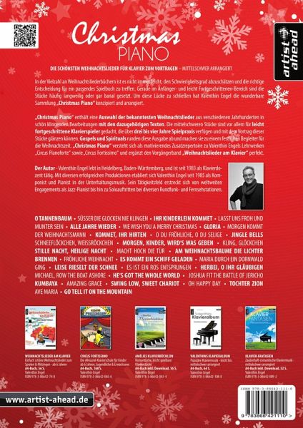 In der Vielzahl an Weihnachtsliederbüchern ist es nicht immer leicht, den Schwierigkeitsgrad abzuschätzen und die richtige Entscheidung für ein passendes Spielbuch zu treffen. Gerade im Anfänger- und leicht Fortgeschrittenen-Bereich sind die Stücke häufig langweilig oder gar banal gesetzt. Um diese Lücke zu schließen hat Valenthin Engel die wunderbare Sammlung Christmas Piano konzipiert und arrangiert.