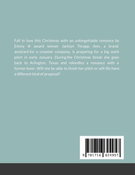 Fall in love this Christmas with an unforgettable romance by Emmy ® award winner Jacklyn Thrapp. Ann, a brand assistantfor a creamer company, is preparing for a big work pitch in early January. Duringthe Christmas break she goes back to Arlington, Texas and rekindles a romance with a formerlover. Will she be able to finish her pitch or will life have a different kind of proposal?