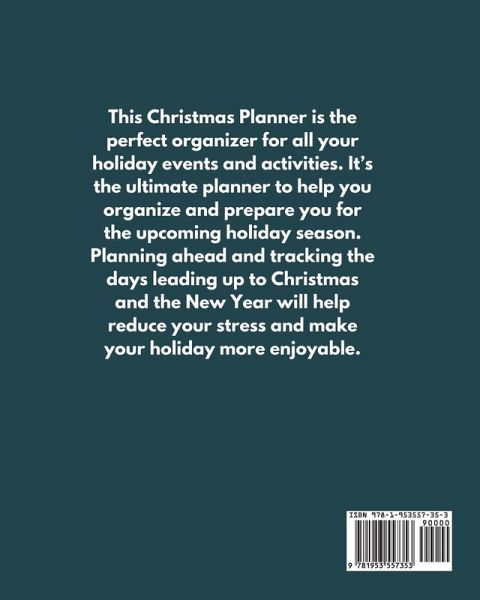 This Christmas Planner is the perfect organizer for all your holiday events and activities. It's the ultimate planner to help you organize and prepare you for the upcoming holiday season. Planning ahead and tracking the days leading up to Christmas and the New Year will help reduce your stress and make your holiday more enjoyable. This planner makes a great gift for family and friends. Features:Happy Holidays Page- overview of holiday plans Holiday Expense Tracker- date, description, category, amount Christmas Budget Tracker- spending tracker, budget goal, actual spending November & December Planning Calendar November & December Checklist Pages Christmas Countdown Pages Elf On The Shelf Planner Holiday Playlist- band and artist music info Holiday Movies To Watch Pages- record favorite movies & TV shows, rate favorite movies Holiday Books To Read- plan your holiday reading and record title, author, and book review Gift Ideas & Checklist- plan who the gift is for, gift idea, and store Stocking Stuffer Ideas- write down ideas for 12 people Holiday Wish List- record your list of items Holiday Card Tracker Pages- space to record name and address Christmas Planner Gift Pages- record recipients name, gift ideas, item description, store/website, and price Black Friday, Cyber Monday, and Online Shopping Planner Pages Cookie Baking List- plan cookie recipient list and delivery Christmas Eve, Christmas, and New Years Eve Planning Pages- pages for planning, meal planner, grocery list, checklist, holiday schedule with time slots, record holiday traditions Gifts Received Pages Holiday Gratitude Page- space to write what you are grateful for Holiday Recipe Pages Details:Size: 8" x 10" Pages: 110 Paperback Matte finish Order this book today to start the countdown to a Very Merry Christmas! Makes a great gift for family and friends.