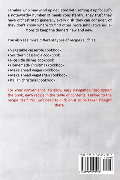 Families who may wind up depleted with setting it up for such a noteworthy number of meals consistently. They trust they have orchestrated generally every dish they can consider, or they don't know where to find other more innovative equations to keep the dinners new and new. You also see more different types of recipes such as: ¿ Vegetable casserole cookbook ¿ Southern casserole cookbook ¿ Rice side dishes cookbook ¿ Homemade christmas cookbook ¿ Make ahead vegan cookbook ¿ Make ahead vegetarian cookbook ¿ Italian christmas cookbook For your convenience, to allow easy navigation throughout the book, each recipe in the table of contents is linked to the recipe itself. You just need to click on it to be taken straight there.