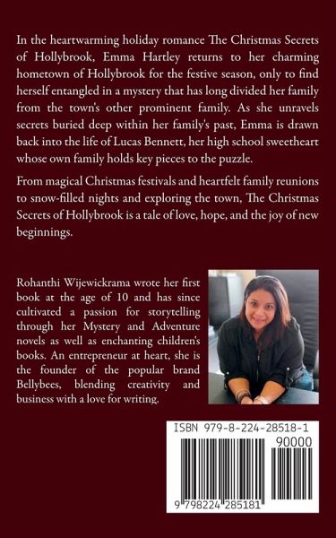 In the heartwarming holiday romance The Christmas Secrets of Hollybrook, Emma Hartley returns to her charming hometown of Hollybrook for the festive season, only to find herself entangled in a mystery that has long divided her family from the town's other prominent family. As she unravels secrets buried deep within her family's past, Emma is drawn back into the life of Lucas Bennett, her high school sweetheart whose own family holds key pieces to the puzzle. Amidst the twinkling Christmas lights and snow-covered streets, Emma and Lucas work together to uncover the truth behind a missing locket that once symbolized their grandparents' forbidden love. As they navigate old grudges and rekindle their own romance, they discover that the key to healing their families' rifts and forging a future together lies in confronting the past and embracing the power of forgiveness. From magical Christmas festivals and heartfelt family reunions to snow-filled nights and exploring the town, The Christmas Secrets of Hollybrook is a tale of love, hope, and the joy of new beginnings. Join Emma and Lucas as they learn that the true spirit of Christmas is about mending broken bonds, celebrating the present, and believing in the promise of happily ever after.