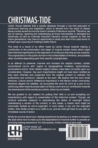 NEW PRINT WITH PROFESSIONAL TYPE-SET IN CONTRAST TO SCANNED PRINTS OFFERED BY OTHERS Christmas-Tide This book is a result of an effort made by us towards making a contribution to the preservation and repair of original classic literature. In an attempt to preserve, improve and recreate the original content, we have worked towards: 1. Type-setting & Reformatting: The complete work has been re-designed via professional layout, formatting and type-setting tools to re-create the same edition with rich typography, graphics, high quality images, and table elements, giving our readers the feel of holding a 'fresh and newly' reprinted and/or revised edition, as opposed to other scanned & printed (Optical Character Recognition - OCR) reproductions. 2. Correction of imperfections: As the work was re-created from the scratch, therefore, it was vetted to rectify certain conventional norms with regard to typographical mistakes, hyphenations, punctuations, blurred images, missing content/pages, and/or other related subject matters, upon our consideration. Every attempt was made to rectify the imperfections related to omitted constructs in the original edition via other references. However, a few of such imperfections which could not be rectified due to intentional\unintentional omission of content in the original edition, were inherited and preserved from the original work to maintain the authenticity and construct, relevant to the work. We believe that this work holds historical, cultural and/or intellectual importance in the literary works community, therefore despite the oddities, we accounted the work for print as a part of our continuing effort towards preservation of literary work and our contribution towards the development of the society as a whole, driven by our beliefs. We are grateful to our readers for putting their faith in us and accepting our imperfections with regard to preservation of the historical content. HAPPY READING!