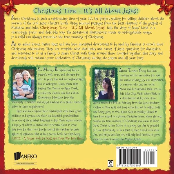 Since Christmas is such a captivating time of year, it's the perfect setting for telling children about the miracle of the Lord Jesus Christ's birth. Using selected passages from the first chapters of the gospels of Matthew and Luke, Christmas Time - It's All About Jesus tells the story of Jesus' birth in a delightfully poetic and child-like way. The sensational illustrations create an unforgettable image, so a child can always remember the true meaning of Christmas. As an added bonus, Pastor Russ and Sue have developed devotionals to be used by families to enrich their Christmas celebrations. These are complete with attributes and names of Jesus, questions for discussion, and activities to do as a family to share Christ with those around them. Coupled together, this story and devotionals will enhance your celebration of Christmas during the season and all year long! About the Author Sue Murray Barksdale has been a pastor's wife, mom, and educator for over 30 years. She and her husband Russ live in Arlington, Texas, where Russ pastors the multi-site The Church on Rush Creek, a multi-site church. Sue has a BS in Elementary Education from The University of Houston and enjoys teaching at a public charter school in their neighborhood. Russ and Sue consider their relationship with their grown children and spouses and their six beautiful grandchildren as one of the greatest blessings in life! Their desire to leave a legacy of Christ-centered lives motivated them to write this book for their own family and all the children in their sphere of influence. This is Sue's second book, her first being G.I.F.T.S.: A Prayer Book for Kids and Those Who Love Them.