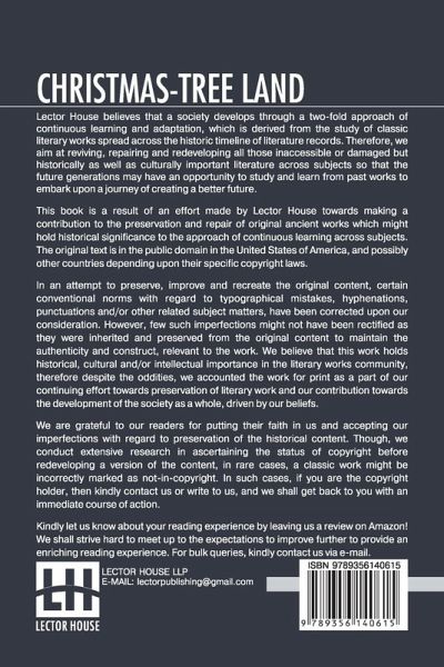 NEW PRINT WITH PROFESSIONAL TYPE-SET IN CONTRAST TO SCANNED PRINTS OFFERED BY OTHERS Christmas-Tree Land This book is a result of an effort made by us towards making a contribution to the preservation and repair of original classic literature. In an attempt to preserve, improve and recreate the original content, we have worked towards: 1. Type-setting & Reformatting: The complete work has been re-designed via professional layout, formatting and type-setting tools to re-create the same edition with rich typography, graphics, high quality images, and table elements, giving our readers the feel of holding a 'fresh and newly' reprinted and/or revised edition, as opposed to other scanned & printed (Optical Character Recognition - OCR) reproductions. 2. Correction of imperfections: As the work was re-created from the scratch, therefore, it was vetted to rectify certain conventional norms with regard to typographical mistakes, hyphenations, punctuations, blurred images, missing content/pages, and/or other related subject matters, upon our consideration. Every attempt was made to rectify the imperfections related to omitted constructs in the original edition via other references. However, a few of such imperfections which could not be rectified due to intentional\unintentional omission of content in the original edition, were inherited and preserved from the original work to maintain the authenticity and construct, relevant to the work. We believe that this work holds historical, cultural and/or intellectual importance in the literary works community, therefore despite the oddities, we accounted the work for print as a part of our continuing effort towards preservation of literary work and our contribution towards the development of the society as a whole, driven by our beliefs. We are grateful to our readers for putting their faith in us and accepting our imperfections with regard to preservation of the historical content. HAPPY READING!