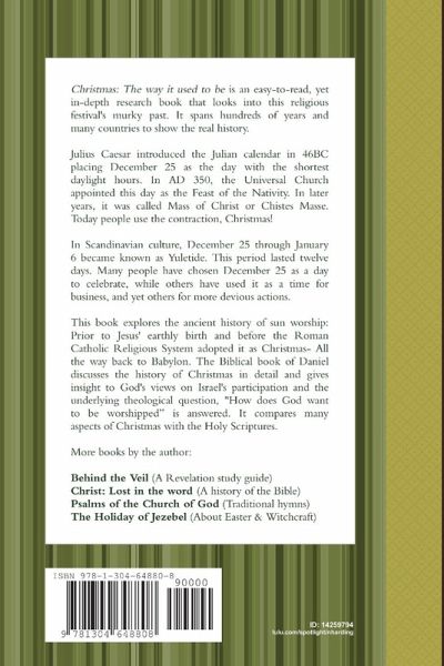 Christmas: The way it used to be is an easy-to-read, yet in-depth research book that looks into this religious festival's murky past. It spans hundreds of years and many countries to show the real history. Julius Caesar introduced the Julian calendar in 46BC placing December 25 as the day with the shortest daylight hours. In AD 350, this day was appointed as the Feast of the Nativity. In later years, it was called Mass of Christ. Today people use the contraction, Christmas! In Scandinavian culture, December 25 through January 6 became known as Yuletide. This period lasted 12 days. Many people celebrate December 25: Some for worship, some for business, and others for more devious actions. This book explores the ancient history of sun worship: Prior to Jesus' earthly birth- all the way back to Babylon. It gives insight to God's views on Israel's participation and answers the question, "How does God want to be worshipped". It compares many aspects of Christmas with the Holy Scriptures.