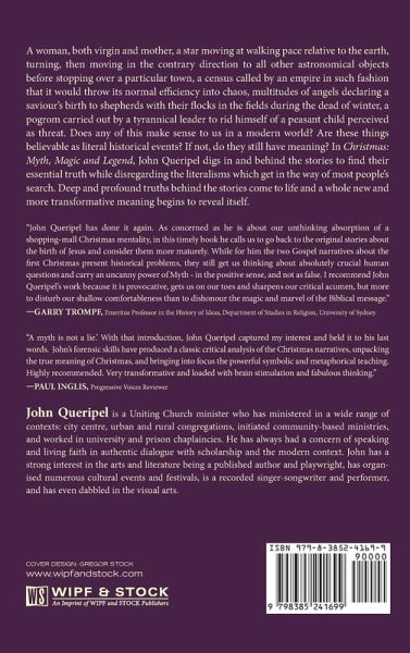 A woman, both virgin and mother, a star moving at walking pace relative to the earth, turning, then moving in the contrary direction to all other astronomical objects before stopping over a particular town, a census called by an empire in such fashion that it would throw its normal efficiency into chaos, multitudes of angels declaring a saviour's birth to shepherds with their flocks in the fields during the dead of winter, a pogrom carried out by a tyrannical leader to rid himself of a peasant child perceived as threat. Does any of this make sense to us in a modern world? Are these things believable as literal historical events? If not, do they still have meaning? In Christmas: Myth, Magic and Legend, John Queripel digs in and behind the stories to find their essential truth while disregarding the literalisms which get in the way of most people's search. Deep and profound truths behind the stories come to life and a whole new and more transformative meaning begins to reveal itself.