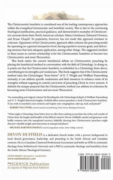 The Christocentric homiletic is considered one of the leading contemporary approaches within the evangelical hermeneutic and homiletic society. This is due to the convincing theological justification, practical guidance, and demonstrative examples of Christocentric sermons from three North American scholars: Sidney Greidanus, Edmund Clowney, and Bryan Chapell. Its popularity, however, has not made this approach immune to criticism. Opponents of the Christocentric approach often criticize the preaching model for operating on a general interpretive level, having repetitive sermon goals, and delivering sermons that lack adequate application, among other things. The suggested antidote to these issues in current scholarship is for the Christocentric homiletic to become less Christocentric and more Theocentric. This book enters the current homiletical debate on Christocentric preaching by placing the homiletical method in conversation with the field of Christology. In doing so, it points out that the Christocentric homiletic is embedded in a Christology from above, contributing to its strengths and weaknesses. This book suggests that if the Christocentric method takes the Christologies ""from below"" of N. T. Wright and Wolfhart Pannenberg seriously, it can address specific weaknesses and find resources to enhance some of its strengths without negating its central conviction of preaching Christ in every sermon. It defends the unique proposal that the Christocentric method can address its criticisms by becoming more Christocentric and not more Theocentric.
