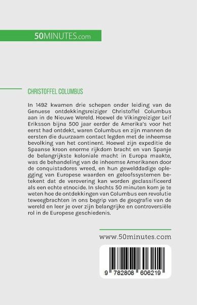 In 1492 kwamen drie schepen onder leiding van de Genuese ontdekkingsreiziger Christoffel Columbus aan in de Nieuwe Wereld. Hoewel de Vikingreiziger Leif Eriksson bijna 500 jaar eerder de Amerika's voor het eerst had ontdekt, waren Columbus en zijn mannen de eersten die duurzaam contact legden met de inheemse bevolking van het continent. Hoewel zijn expeditie de Spaanse kroon enorme rijkdom bracht en van Spanje de belangrijkste koloniale macht in Europa maakte, was de behandeling van de inheemse Amerikanen door de conquistadores wreed, en hun gewelddadige oplegging van Europese waarden en geloofssystemen betekent dat de verovering kan worden geclassificeerd als een echte etnocide. In slechts 50 minuten kom je te weten hoe de ontdekkingen van Columbus een revolutie teweegbrachten in ons begrip van de geografie van de wereld en leer je over zijn belangrijke en controversiële rol in de Europese geschiedenis. Dit eenvoudige en informatieve boek geeft een grondige bespreking van de vier expedities van Columbus en de ontdekkingen die hij bij elke expeditie deed. Het bevat ook een volledige biografie, een waardevolle inleiding tot de politieke, sociale en economische context en een evaluatie van de impact van zijn expedities, waardoor u alle essentiële informatie krijgt over deze invloedrijke ontdekkingsreiziger.