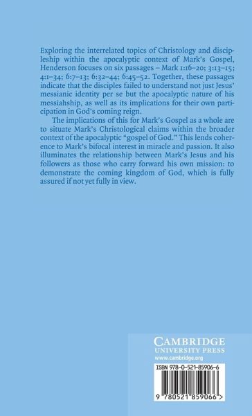 Exploring the interrelated topics of Christology and discipleship within the apocalyptic context of Mark's Gospel, Henderson focuses on six passages: Mark 1:16-20; 3:13--15; 4:1-34; 6:7-13; 6:32-44; 6:45-52. Together, these passages indicate that the disciples failed to understand not just Jesus' messianic identity per se but the apocalyptic nature of his messiahship, as well as its implications for their own participation in God's coming reign. The implications of this for Mark's gospel as a whole are to situate Mark's Christological claims within the broader context of the apocalyptic 'gospel of God'. This lends coherence to Mark's bifocal interest in miracle and passion. It also illuminates the relationship between Mark's Jesus and his followers as those who carry forward his own mission: to demonstrate the coming kingdom of God, which is fully assured if not yet fully in view.
