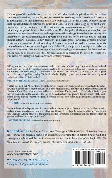 If the origin of the world is not a part of the world, what are the implications for our understanding of ourselves, the world, and its origin? In antiquity, both gentile and Christian authors agreed that the significance of this question could only be maintained by accepting the unbridgeable difference between the world and God. Not even Christology as the most ambitious attempt at developing a model for divine-human communication was allowed to undermine the principle of absolute divine difference. This changed with the modern emphasis on univocity and measurability as the defining aspects of knowledge. From the point of view of a philosophy of absolute difference, this appears as an arbitrary loss of perspective. By focusing on four authors--Cusanus, Luther, Hamann, and Kierkegaard--who have explored how the Christian and paradoxical understanding of Christ as eternal God and true human subverts the modern emphasis on unambiguity and definability, the present investigation makes an attempt to retrieve what has been lost. Classical Christology as interpreted by these authors thus appears as an indispensable tool for receiving and appreciating the gift of the world in a way that is not unduly limited by anthropocentric prejudice. ""Alfsvag's work is a further contribution to the deconstruction of modernity. It draws on the critical and constructive potential of premodern insights deployed by Cusanus and Luther and retrieved by Hamann and Kierkegaard. These insights, in line with Scripture and Chalcedonian Christology, are then applied to key theological problems today. The book, which I highly recommend, is accessible to the general reader but written for the scholar."" --Jeffrey Silcock, Australian Lutheran College / University of Divinity ""In this volume Knut Alfsvag tests the relationship between Christianity, and more specifically Christology, and other modes of recent thought by a deep yet focused examination of the relevant positions of Nicolas of Cusa, Martin Luther, Johann Hamann, and Soren Kierkegaard . . . Ultimately, Alfsvag argues that we would do well to consider the ties to created realities that ground the arguments of the early church as well as these select theologians, as we consider our own scientific, philosophical, and theological positions."" --Tim Dost, Concordia Seminary, St. Louis, Missouri ""What is the relationship between the world and the human? Against the irrationality of modernism this study proffers a surprising answer: the indispensability of Christology. Drawing on a line of counter-cultural thinkers, Alfsvag draws out the implications for our time in stimulating fashion. This is a study of gravitas, with far-reaching significance."" --Gordon L. Isaac, Gordon Conwell Theological Seminary Knut Alfsvag is Professor of Systematic Theology at VID Specialized University, Stavanger, Norway. His research focuses on questions concerning the understanding of God and theological method, and the relation between the two. He is the author of the book What No Mind Has Conceived: On the Significance of Christological Apophaticism (2010).