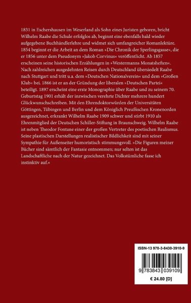 Wilhelm Raabe: Christoph Pechlin. Eine internationale Liebesgeschichte Entstanden zwischen August 1871 und September 1872. Erstdruck bei Ernst Julius Günther, Leipzig, 1873. Vollständige Neuausgabe mit einer Biographie des Autors. Herausgegeben von Karl-Maria Guth. Berlin 2015. Umschlaggestaltung von Thomas Schultz-Overhage unter Verwendung des Bildes: Arnold Böcklin, Flitterwochen, 1890. Gesetzt aus Minion Pro, 11 pt. Über den Autor: 1831 in Eschershausen im Weserland als Sohn eines Juristen geboren, bricht Wilhelm Raabe die Schule erfolglos ab, beginnt eine ebenfalls bald wieder aufgegebene Buchhändlerlehre und widmet sich umfangreicher Romanlektüre. 1854 beginnt er die Arbeit an dem Roman »Die Chronik der Sperlingsgasse«, die er 1856 unter dem Pseudonym »Jakob Corvinus« veröffentlicht. Ab 1857 erscheinen seine historischen Erzählungen in »Westermanns Monatsheften«. Nach zahlreichen ausgedehnten Reisen durch Deutschland übersiedelt Raabe nach Stuttgart und tritt u.a. dem »Deutschen Nationalverein« und dem »Großen Klub« bei. 1866 ist er an der Gründung der liberalen »Deutschen Partei« beteiligt. 1897 erscheint eine erste Monographie über Raabe und zu seinem 70. Geburtstag 1901 erhält der inzwischen verehrte Dichter mehrere hundert Glückwunschschreiben. Mit den Ehrendoktorwürden der Universitäten Göttingen, Tübingen und Berlin und dem Königlich Preußischen Kronenorden ausgezeichnet, erkrankt Wilhelm Raabe 1909 schwer und stirbt 1910 als Ehrenmitglied der Deutschen Schiller-Stiftung in Braunschweig. Wilhelm Raabe ist neben Theodor Fontane einer der großen Vertreter des poetischen Realismus. Seine plastischen Darstellungen realistischer Bildlichkeit sind mit seiner Sympathie für Außenseiter humoristisch stimmungsvoll. »Die Figuren meiner Bücher sind sämtlich der Fantasie entnommen; nur selten ist das Landschaftliche nach der Natur gezeichnet. Das Volkstümliche fasse ich instinktiv auf.«