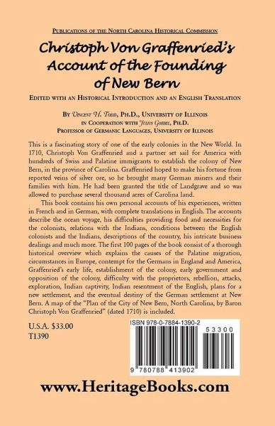 This is a fascinating story of one of the early colonies in the New World. In 1710, Christoph Von Graffenried and a partner set sail for America with hundreds of Swiss and Palatine immigrants to establish the colony of New Bern, in the province of Carolina. Graffenried hoped to make his fortune from reported veins of silver ore, so he brought many German miners and their families with him. He had been granted the title of Landgrave and so was allowed to purchase several thousand acres of Carolina land. This book contains his own personal accounts of his experiences, written in French and in German, with complete translations in English. The accounts describe the ocean voyage, his difficulties providing food and necessities for the colonists, relations with the Indians, conditions between the English colonists and the Indians, descriptions of the country, his intricate business dealings and much more. The first 100 pages of the book consist of a thorough historical overview which explains the causes of the Palatine migration, circumstances in Europe, contempt for the Germans in England and America, Graffenried's early life, establishment of the colony, early government and opposition of the colony, difficulty with the proprietors, rebellion, attacks, exploration, Indian captivity, Indian resentment of the English, plans for a new settlement, and the eventual destiny of the German settlement at New Bern. Also includes a fold-out map the "Plan of the City of New Bern, North Carolina, by Baron Christoph Von Graffenried" dated 1710.