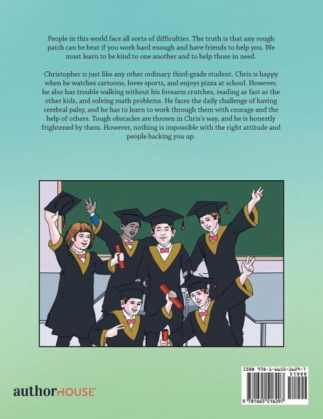 People in this world face all sorts of difficulties. The truth is that any rough patch can be beat if you work hard enough and have friends to help you. We must learn to be kind to one another and to help those in need. Christopher is just like any other ordinary third-grade student. Chris is happy when he watches cartoons, loves sports, and enjoys pizza at school. However, he also has trouble walking without his forearm crutches, reading as fast as the other kids, and solving math problems. He faces the daily challenge of having cerebral palsy, and he has to learn to work through them with courage and the help of others. Tough obstacles are thrown in Chris's way, and he is honestly frightened by them. However, nothing is impossible with the right attitude and people backing you up.