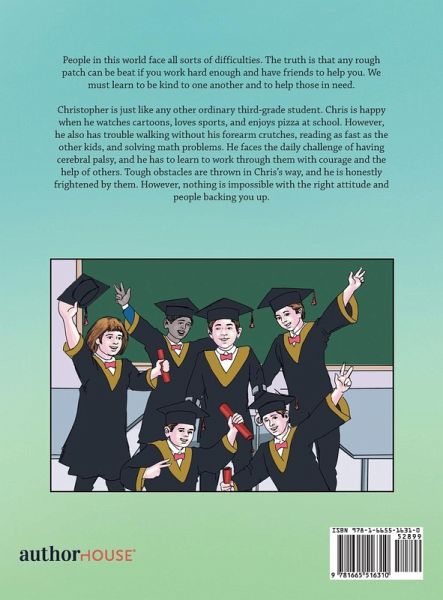 People in this world face all sorts of difficulties. The truth is that any rough patch can be beat if you work hard enough and have friends to help you. We must learn to be kind to one another and to help those in need. Christopher is just like any other ordinary third-grade student. Chris is happy when he watches cartoons, loves sports, and enjoys pizza at school. However, he also has trouble walking without his forearm crutches, reading as fast as the other kids, and solving math problems. He faces the daily challenge of having cerebral palsy, and he has to learn to work through them with courage and the help of others. Tough obstacles are thrown in Chris's way, and he is honestly frightened by them. However, nothing is impossible with the right attitude and people backing you up.