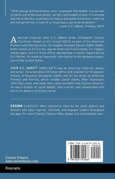 "With energy and fearlessness never surpassed, Christopher Carson was certainly one of the most gentle, upright, and lovable of men. It is strange that the wilderness could have formed so estimable a character. America will not permit the virtues of so illustrious a son to be forgotten." -John S.C. Abbott, Preface, 1873 American historian John S.C. Abbott wrote Christopher Carson: Familiarly Known as Kit Carson (1873) as part of his American Pioneers and Patriots series. Christopher Houston Carson (1809-1868), better known as Kit Carson, was an American frontiersman, fur trapper, Indian agent, and US Army officer who became a frontier legend during his lifetime. He made an important contribution to the westward expansion of the United States.
