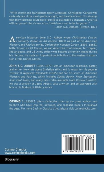 "With energy and fearlessness never surpassed, Christopher Carson was certainly one of the most gentle, upright, and lovable of men. It is strange that the wilderness could have formed so estimable a character. America will not permit the virtues of so illustrious a son to be forgotten." -John S.C. Abbott, Preface, 1873 American historian John S.C. Abbott wrote Christopher Carson: Familiarly Known as Kit Carson (1873) as part of his American Pioneers and Patriots series. Christopher Houston Carson (1809-1868), better known as Kit Carson, was an American frontiersman, fur trapper, Indian agent, and US Army officer who became a frontier legend during his lifetime. He made an important contribution to the westward expansion of the United States.