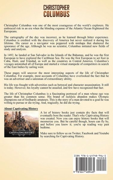 If you want to discover the captivating life of Christopher Columbus, then keep reading... Christopher Columbus was one of the most courageous of the world's explorers. He embraced risk in an era when the blinding expanse of the Atlantic Ocean frightened the Europeans. The cartography of the day was incorrect, as he learned through bitter experience. Columbus is credited with the discovery of America but never realized it during his lifetime. His career as a navigator was peppered with mishaps that shattered the ignorance of the age. Although he was no scientist, Columbus initiated new fields of study and analysis. In 1492, he landed at San Salvador in the Islands of the Bahamas, and he was the first European to have explored the Caribbean Sea. He was the first European to set foot in Cuba, Haiti, and Trinidad, as well as the countries in Central America. Columbus's voyages astonished all of Europe and started a virtual stampede of competitors in search of the East Indies by sailing west. His life was fraught with adversities such as betrayal and character assassination. It still is today. However, his loyalty cannot be assailed, and few have recognized that fact. The life of Christopher Columbus is a fascinating portrayal of a man whose ego was greater than his common sense. His brand of reckless abandon makes Olympic champions out of foolhardy amateurs. This is the story of a man devoted to a goal he was willing to pursue or die trying. And, tragically, he did die trying. In Christopher Columbus: A Captivating Guide to the Life of an Italian Explorer and His Voyages to the Americas, you will discover topics such asInto the Blue Unknown Dead Reckoning Forward Initial Exploration Second Voyage Third Voyage: Chaos Reigns The Last Voyage And much, much more! So if you want to learn more about Christopher Columbus, scroll up and click the "add to cart" button!