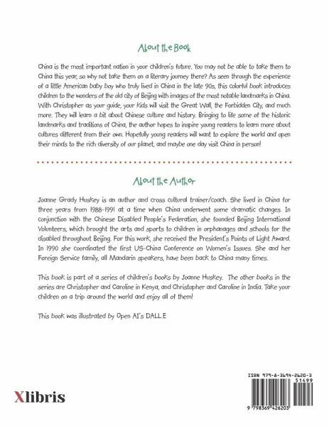 China is the most important nation in your children's future. You may not be able to take them to China this year, so why not take them on a literary journey there? As seen through the experience of a little American baby boy who truly lived in China in the late 90s, this colorful book introduces children to the wonders of the old city of Beijing with images of the most notable landmarks in China. With Christopher as your guide, your kids will visit the Great Wall, the Forbidden City, and much more. They will learn a bit about Chinese culture and history. Bringing to life some of the historic landmarks and traditions of China, the author hopes to inspire young readers to learn more about cultures different from their own. Hopefully young readers will want to explore the world and open their minds to the rich diversity of our planet, and maybe one day visit China in person!