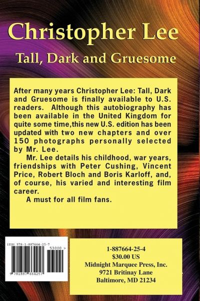 International film actor Christopher Lee details his childhood, war years, friendships with Peter Cushing, Vincent Price, Robert Bloch and Boris Karloff, and, of course, his varied and interesting film career. Mr. Lee first published his autobiography in Britian in 1977. The Midnight Marquee edition is updated, Americanized and includes many new and rare photos personally selected by Mr. Lee A must for all film fans. Released before the filming of Lord of the Rings and Star Wars.