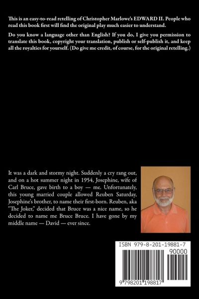 This is an easy-to-read retelling of Christopher Marlowe's EDWARD II. People who read this book first will find the original play much easier to understand. Do you know a language other than English? If you do, I give you permission to translate this book, copyright your translation, publish or self-publish it, and keep all the royalties for yourself. (Do give me credit, of course, for the original retelling.)