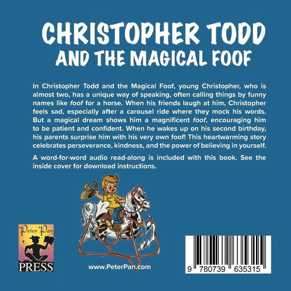 In Christopher Todd and the Magical Foof, young Christopher, who is almost two, has a unique way of speaking, often calling things by funny names like "foof" for a horse. When his friends laugh at him, Christopher feels sad, especially after a carousel ride where they mock his words. But a magical dream shows him a magnificent foof, encouraging him to be patient and confident. When he wakes up on his second birthday, his parents surprise him with his very own foof! This heartwarming story celebrates perseverance, kindness, and the power of believing in yourself. A word-for-word audio read-along is included with this book. See the inside cover for download instructions.