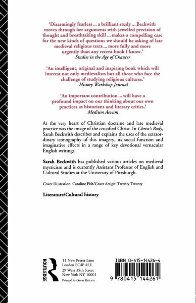 At the very heart of Christian doctrine and late medieval practice was the image of the crucified Christ. Sarah Beckwith examines the social meaning of this image across a range of key devotional English texts, using insights from anthropology and cultural studies. The image of the crucified Christ, she argues, acted as a place where the tensions between the sacred and the profane, the individual and the collective, were played out. The medieval obsession with the contours of Christ's body functioned to challenge and transform social and political relations. A fascinating and challenging book of interest not only to students of medieval literature, but also to cultural historians and women's studies specialists.