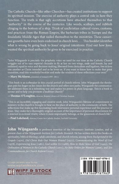 The Catholic Church--like other churches--has created institutions to support its spiritual mission. The exercise of authority plays a central role in how they function. The truth is that ugly accretions have attached themselves to that ""authority"" in the course of the centuries. Like weeds, scallops, and rubbish clinging to the bottom of a ship. Think of unchristian cultural views, customs, and practices from the Roman Empire, the barbarian tribes in Europe and the feudalistic Middle Ages that nailed themselves to the ministries. These cancerous growths have even been enshrined in church laws. . . . This booklet identifies what is wrong by going back to Jesus' original intentions. Find out how Jesus wanted the spiritual authority he gives to be exercised in practice.