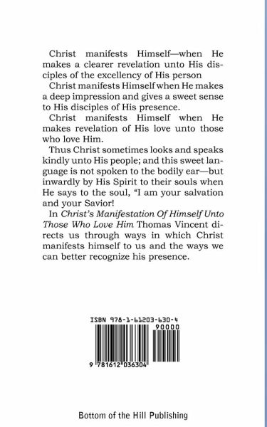 Christ manifests Himself-when He makes a clearer revelation unto His disciples of the excellency of His person Christ manifests Himself when He makes a deep impression and gives a sweet sense to His disciples of His presence. Christ manifests Himself when He makes revelation of His love unto those who love Him. Thus Christ sometimes looks and speaks kindly unto His people; and this sweet language is not spoken to the bodily ear-but inwardly by His Spirit to their souls when He says to the soul, "I am your salvation and your Savior! In Christ's Manifestation Of Himself Unto Those Who Love Him Thomas Vincent directs us through ways in which Christ manifests himself to us and the ways we can better recognize his presence.
