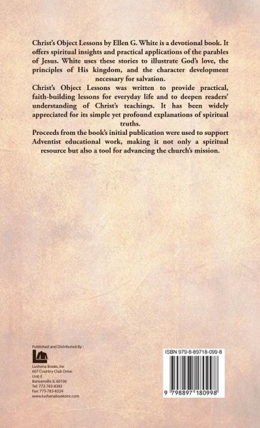 Christ's Object Lessons by Ellen G. White is a devotional book. It offers spiritual insights and practical applications of the parables of Jesus. White uses these stories to illustrate God's love, the principles of His kingdom, and the character development necessary for salvation. Christ's Object Lessons was written to provide practical, faith-building lessons for everyday life and to deepen readers' understanding of Christ's teachings. It has been widely appreciated for its simple yet profound explanations of spiritual truths. Proceeds from the book's initial publication were used to support Adventist educational work, making it not only a spiritual resource but also a tool for advancing the church's mission..