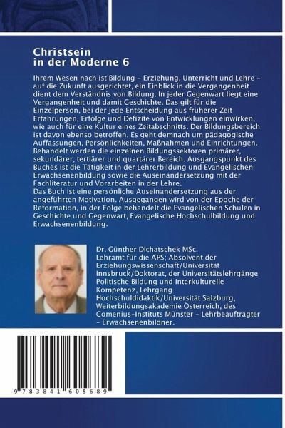 Ihrem Wesen nach ist Bildung - Erziehung, Unterricht und Lehre - auf die Zukunft ausgerichtet, ein Einblick in die Vergangenheit dient dem Verständnis von Bildung. In jeder Gegenwart liegt eine Vergangenheit und damit Geschichte. Das gilt für die Einzelperson, bei der jede Entscheidung aus früherer Zeit Erfahrungen, Erfolge und Defizite von Entwicklungen einwirken, wie auch für eine Kultur eines Zeitabschnitts. Der Bildungsbereich ist davon ebenso betroffen. Es geht demnach um pädagogische Auffassungen, Persönlichkeiten, Maßnahmen und Einrichtungen. Behandelt werden die einzelnen Bildungssektoren primärer, sekundärer, tertiärer und quartärer Bereich. Ausgangspunkt des Buches ist die Tätigkeit in der Lehrerbildung und Evangelischen Erwachsenenbildung sowie die Auseinandersetzung mit der Fachliteratur und Vorarbeiten in der Lehre. Das Buch ist eine persönliche Auseinandersetzung aus der angeführten Motivation. Ausgegangen wird von der Epoche der Reformation, in der Folge behandelt die Evangelischen Schulen in Geschichte und Gegenwart, Evangelische Hochschulbildung und Erwachsenenbildung.