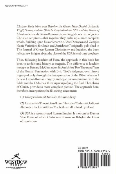 Christus Troia Nova and Babylon the Great: How Daniel, Aristotle, Virgil, Seneca, and the Didache Prophesized the USA and the Return of Christ understands Greco-Roman epic and tragedy as a part of Judeo-Christian scripture-that together they make up a more complete whole. Building upon his earlier article, "Are Dionysos and Oedipus Name Variations for Satan and Antichrist?," originally published in The Journal of Greco-Roman Christianity and Judaism, the book reflects new insights about the place of the USA in end-time prophecy. Thus, following Joachim of Fiore, the approach in this book has been to understand history as exegesis. The difference is Joachim thought as Bernard McGinn notes in Antichrist: Two Thousand Years of the Human Fascination with Evil, 'God's judgment over history is grasped only through the interpretation of the Bible' whereas I believe Greco-Roman tragedy and epic, in conjunction with the Bible and the Didache's three signs signifying the final Theophany of Christ, provides a more complete picture. The approach here, therefore, incorporates the following assessment: (1) Dionysos/Satan/Osiris are the same deity. (2) Canaanites/Phoenicians/Ham/Hercules/Cadmus/Oedipus/Alexander the Great/Nero/Macbeth are all related by blood. (3) USA is a reconstituted Roman Empire. It is or can be Dante's 'that Rome of which Christ was Roman' or Babylon the Great of Revelation.