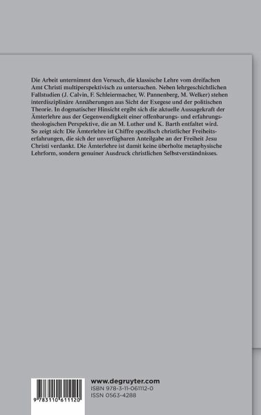 Die Arbeit unternimmt den Versuch, die klassische Lehre vom dreifachen Amt Christi multiperspektivisch zu untersuchen. Neben lehrgeschichtlichen Fallstudien (Calvin, Schleiermacher, Pannenberg, M. Welker) stehen interdisziplinäre Annäherungen aus Sicht der Exegese und der politischen Theorie. In dogmatischer Hinsicht ergibt sich die aktuelle Aussagekraft der Ämterlehre aus der Gegenwendigkeit einer offenbarungs- und erfahrungstheologischen Perspektive, die an M. Luther und K. Barth entfaltet wird. So zeigt sich: Die Ämterlehre ist Chiffre spezifisch christlicher Freiheitserfahrungen, die sich aus der unverfügbaren Anteilgabe an der Freiheit Jesu Christi verdankt. Die Ämterlehre ist damit keine überholte metaphysische Lehrform, sondern genuiner Ausdruck christlichen Selbstverständnisses.